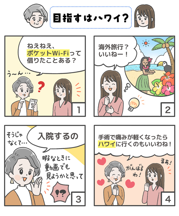 例えば、海外旅行に持っていくイメージがあるポケットWi-Fi(モバイルWi-Fiルーター)も、入院時の使用を想定したレンタルサービスがあるというから驚きです。「入院中に動画を観たいけれどスマホの通信量や通信料金が気になる」といったニーズに対して、ポケットWi-Fiがオプションのひとつとなり得るのかもしれません。