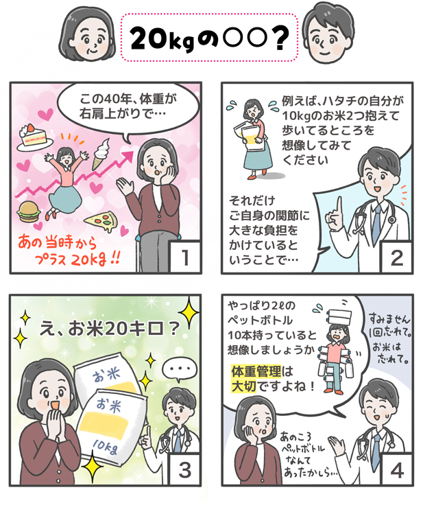 また、関節の痛みや変形の度合いが著しく、人工関節置換術に至った場合も事情は変わりません。手術によって取り替えた新しい関節を長く、快適に使い続けるには、やはり体重管理が欠かせないのです。人工関節置換術を受けた後に医師や理学療法士から「適正体重を意識しましょう」と繰り返しアドバイスを受けるのは、そのためです。