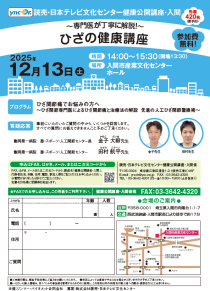 | 講演プログラム | 「ひざの健康講座~専門医が丁寧に解説!~」と題し、整形外科医の金子大毅先生と田村航平先生にご講演いただきます。 |