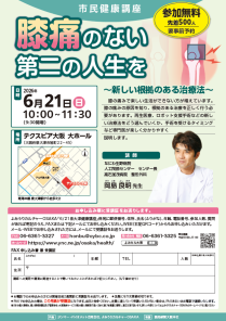 | 講演プログラム | 「膝痛のない第二の人生を~新しい根拠のある治療法~」と題し、整形外科医の岡島良明先生にご講演いただきます。 |